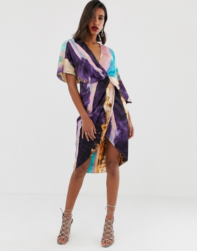 エイソス レディース ワンピース トップス ASOS DESIGN satin kimono midi dress with knot front and asymmetric sleeve in abstract Print Abstract print